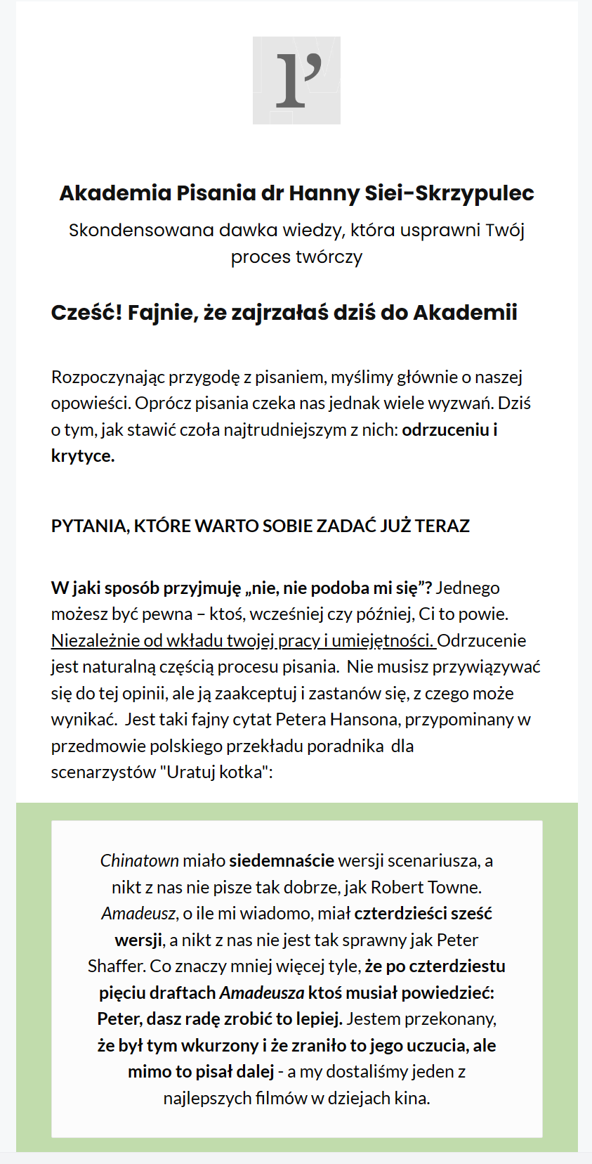 Akademię Pisania stworzyłam po to, by docierać do istoty problemu. Byś po lekturze mojej wiadomości dysponowała konkretnymi narzędziami, a w Twojej głowie pojawiły się nowe znaki zapytania. Znaki zapytania, które zupełnie odmienią proces twórczy. Nadadzą mu rozpędu. Żebyś poczuła się, jak wtedy, gdy jako dziecko pierwszy raz zjeżdżałaś z górki na rowerze. Tej najwyższej.